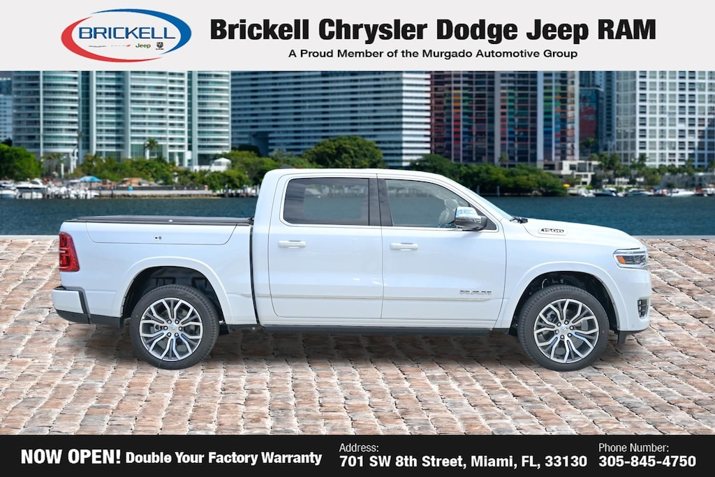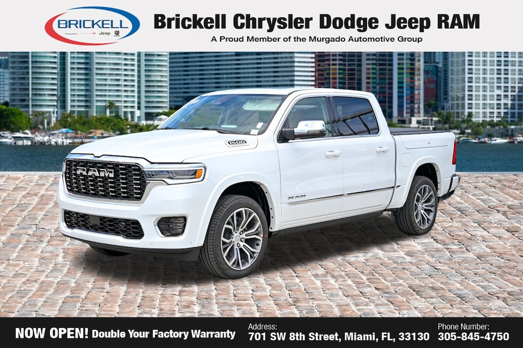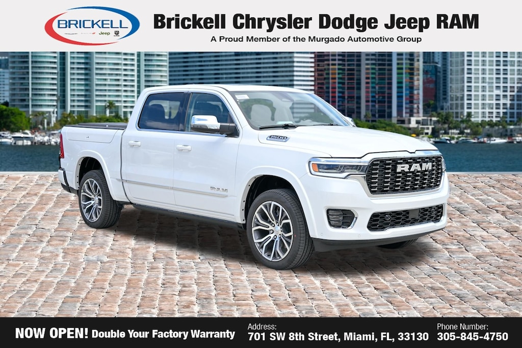 Discover Your Next Vehicle at Brickell Chrysler Dodge Jeep Ram Welcome to Brickell CDJR, where we go beyond selling cars. We double the factory powertrain warranty, giving you added peace of mind. Our dealership offers one of the largest new car inventories in the region, ensuring you find the right vehicle Prices displayed do not included our Perma-plate. Our state-of-the-art service department is the largest in the country and is open seven days a week from 7 AM to 9 PM. Visit us at 701 SW 8th St, Miami, FL 33130, or call 305-777-2800 to learn more and schedule a test drive. The displayed price includes an incentive for financing with Brickell CDJR Finance Company. Outside financing and bank drafts are not accepted. All pre-owned vehicle exports are subject to an export fee. Prices apply only to customers who live, work, or worship in Broward, Miami-Dade, Palm Beach, Monroe, Collier, Hendry, Lee, Glades, Martin, St. Lucie, Okeechobee, Manatee, Hillsborough, Osceola, or Orange County. Customers outside these counties will pay an additional $ Taxes, title, registration, and dealer fees apply. Factory MSRP: $92,530 Ivory White Tri-Coat Pearlcoat 2026 Ram 1500 Tungsten 4WD 8-Speed Automatic 3.0L I6