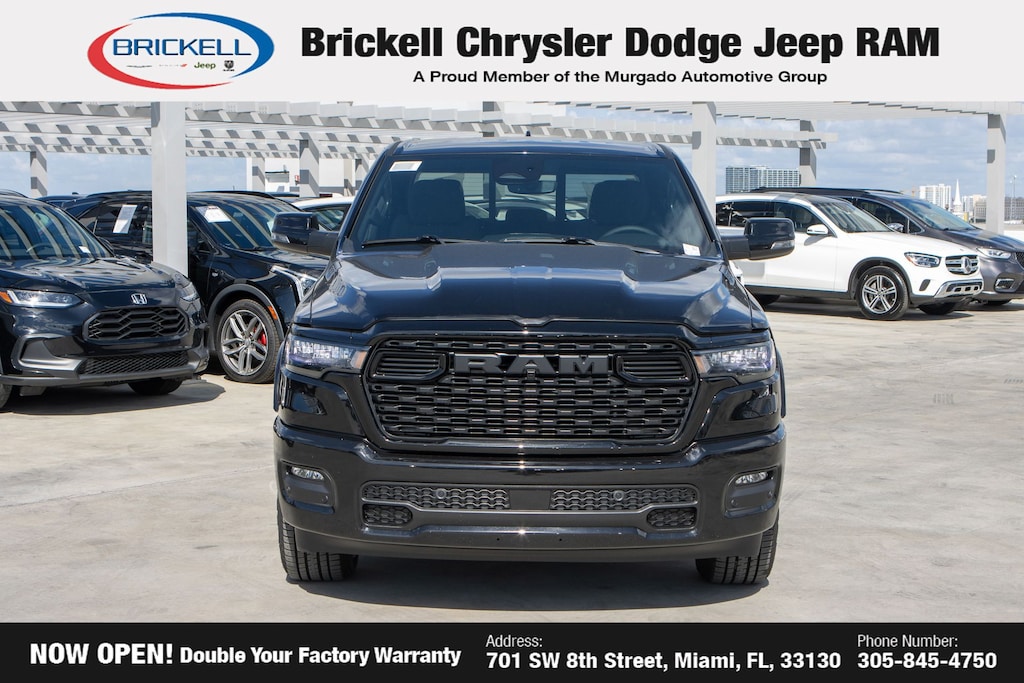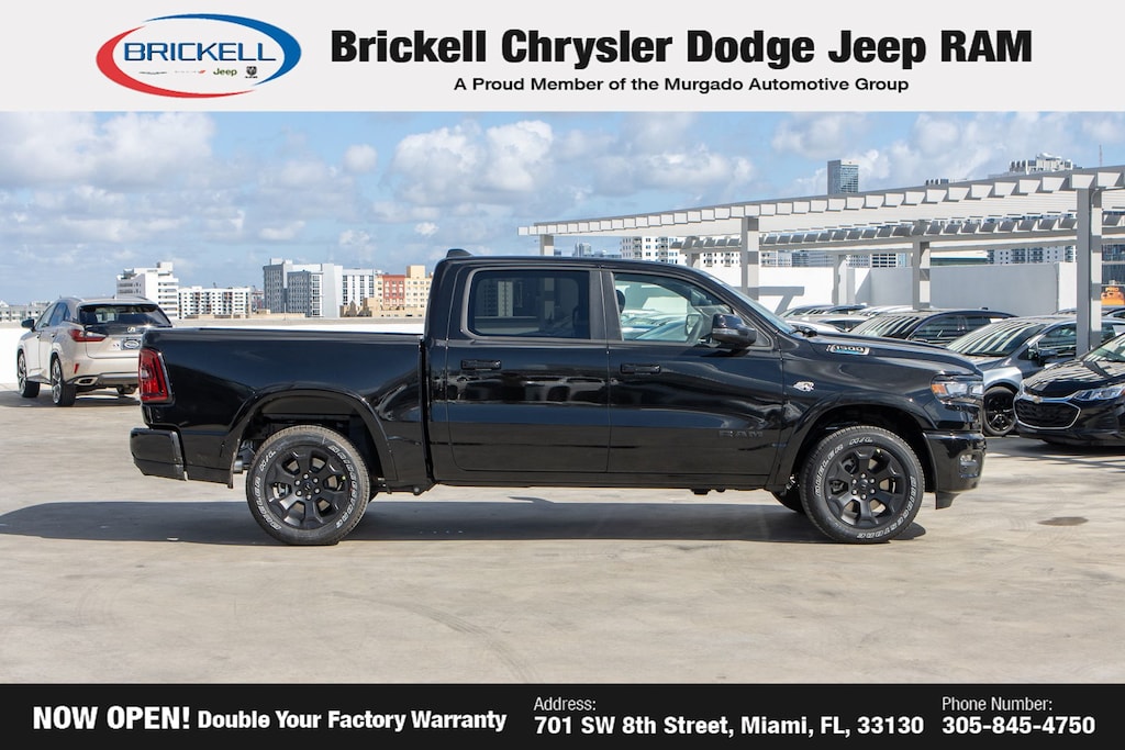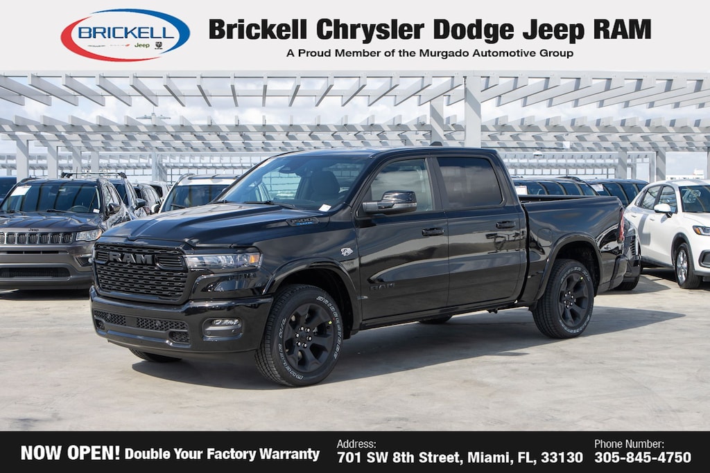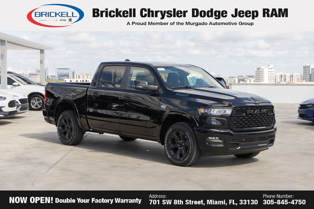 Price includes: $1000 - 2026 South BC Retail Bonus Cash . Exp. 11/03/2025 $3500 - 2026 National Retail Consumer Cash . Exp. 11/03/2025 Discover Your Next Vehicle at Brickell Chrysler Dodge Jeep Ram Welcome to Brickell CDJR, where we go beyond selling cars. We double the factory powertrain warranty, giving you added peace of mind. Our dealership offers one of the largest new car inventories in the region, ensuring you find the right vehicle Prices displayed do not included our Perma-plate. Our state-of-the-art service department is the largest in the country and is open seven days a week from 7 AM to 9 PM. Visit us at 701 SW 8th St, Miami, FL 33130, or call 305-777-2800 to learn more and schedule a test drive. The displayed price includes an incentive for financing with Brickell CDJR Finance Company. Outside financing and bank drafts are not accepted. All pre-owned vehicle exports are subject to an export fee. Prices apply only to customers who live, work, or worship in Broward, Miami-Dade, Palm Beach, Monroe, Collier, Hendry, Lee, Glades, Martin, St. Lucie, Okeechobee, Manatee, Hillsborough, Osceola, or Orange County. Customers outside these counties will pay an additional $ Taxes, title, registration, and dealer fees apply. Factory MSRP: $62,575 Diamond Black Crystal Pearlcoat 2026 Ram 1500 Big Horn/Lone Star 4WD 8-Speed Automatic HEMI 5.7L V8 Multi Displacement VVT eTorque