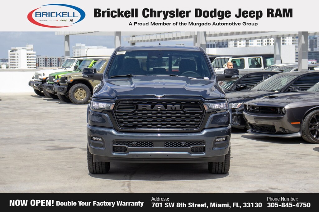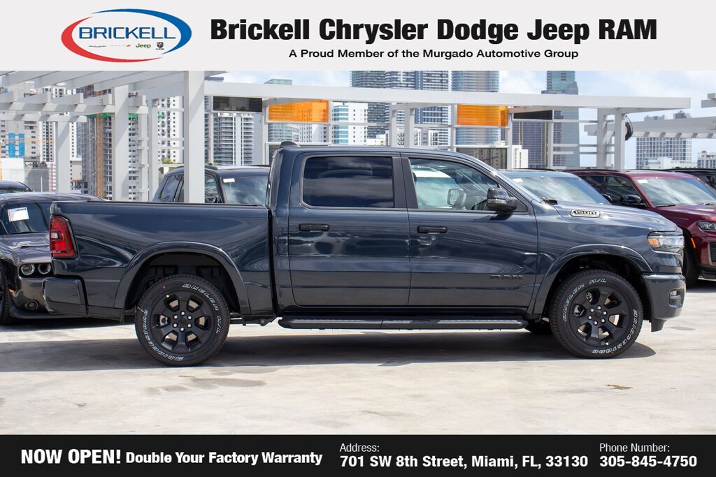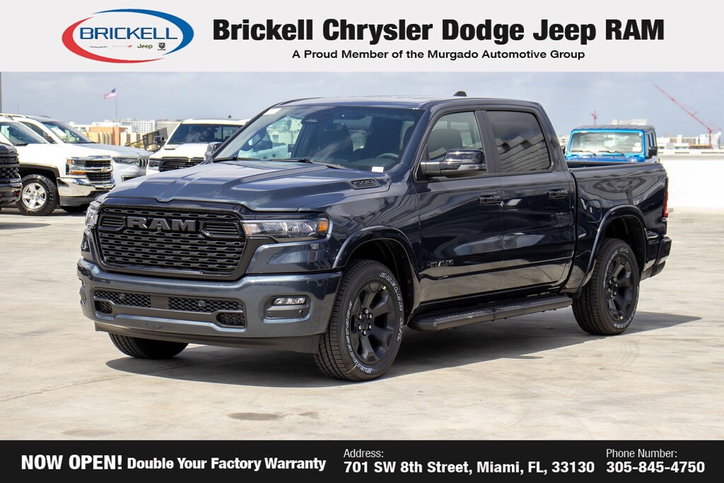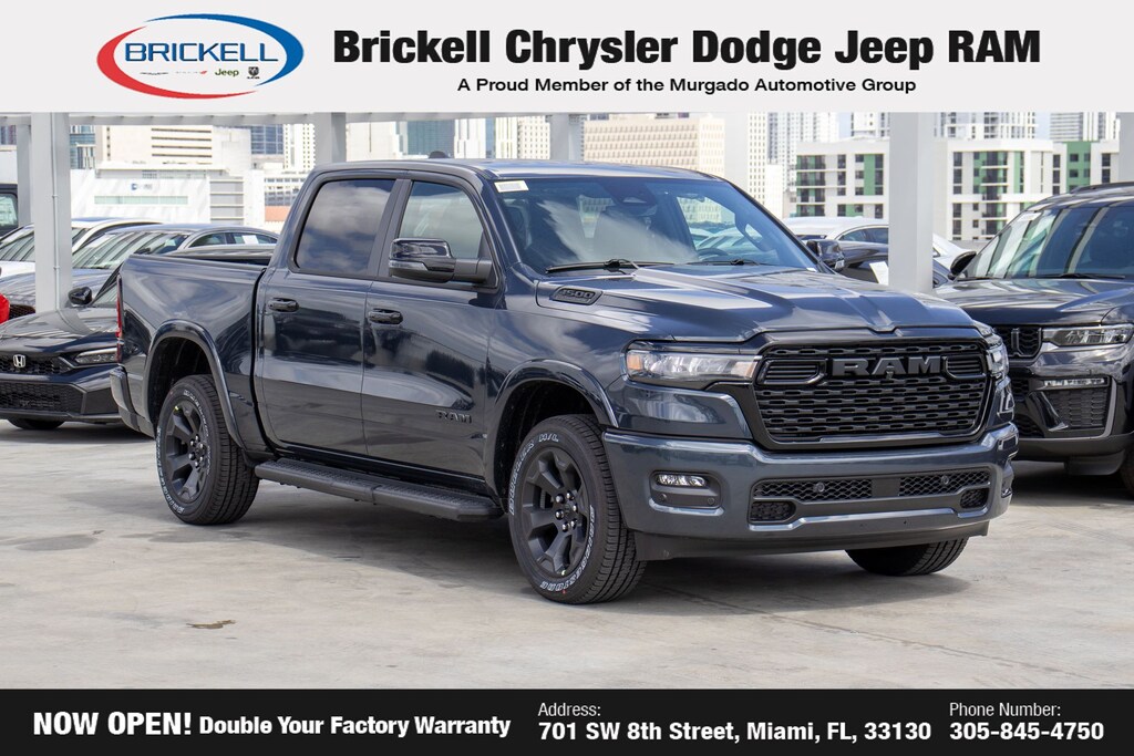 Price includes: $3500 - 2026 National Retail Bonus Cash . Exp. 03/31/2026 $500 - 2026 National 2026 Military Bonus Cash . Exp. 01/04/2027 Discover Your Next Vehicle at Brickell Chrysler Dodge Jeep Ram Welcome to Brickell CDJR, where we go beyond selling cars. We double the factory powertrain warranty, giving you added peace of mind. Our dealership offers one of the largest new car inventories in the region, ensuring you find the right vehicle Prices displayed do not included our Perma-plate. Our state-of-the-art service department is the largest in the country and is open seven days a week from 7 AM to 9 PM. Visit us at 701 SW 8th St, Miami, FL 33130, or call 305-777-2800 to learn more and schedule a test drive. The displayed price includes an incentive for financing with Brickell CDJR Finance Company. Outside financing and bank drafts are not accepted. All pre-owned vehicle exports are subject to an export fee. Prices apply only to customers who live, work, or worship in Broward, Miami-Dade, Palm Beach, Monroe, Collier, Hendry, Lee, Glades, Martin, St. Lucie, Okeechobee, Manatee, Hillsborough, Osceola, or Orange County. Customers outside these counties will pay an additional $ Taxes, title, registration, and dealer fees apply. New Price! Factory MSRP: $63,985 Forged Blue Metallic 2026 Ram 1500 Big Horn/Lone Star 4WD 8-Speed Automatic 3.0L I6
