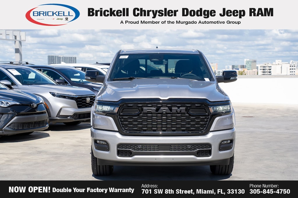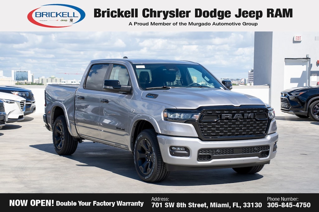 Price includes: $1000 - 2026 South BC Retail Bonus Cash . Exp. 11/03/2025 $3500 - 2026 National Retail Consumer Cash . Exp. 11/03/2025 Discover Your Next Vehicle at Brickell Chrysler Dodge Jeep Ram Welcome to Brickell CDJR, where we go beyond selling cars. We double the factory powertrain warranty, giving you added peace of mind. Our dealership offers one of the largest new car inventories in the region, ensuring you find the right vehicle Prices displayed do not included our Perma-plate. Our state-of-the-art service department is the largest in the country and is open seven days a week from 7 AM to 9 PM. Visit us at 701 SW 8th St, Miami, FL 33130, or call 305-777-2800 to learn more and schedule a test drive. The displayed price includes an incentive for financing with Brickell CDJR Finance Company. Outside financing and bank drafts are not accepted. All pre-owned vehicle exports are subject to an export fee. Prices apply only to customers who live, work, or worship in Broward, Miami-Dade, Palm Beach, Monroe, Collier, Hendry, Lee, Glades, Martin, St. Lucie, Okeechobee, Manatee, Hillsborough, Osceola, or Orange County. Customers outside these counties will pay an additional $ Taxes, title, registration, and dealer fees apply. Factory MSRP: $62,575 Billet Silver Metallic Clearcoat 2026 Ram 1500 Big Horn/Lone Star 4WD 8-Speed Automatic HEMI 5.7L V8 Multi Displacement VVT eTorque
