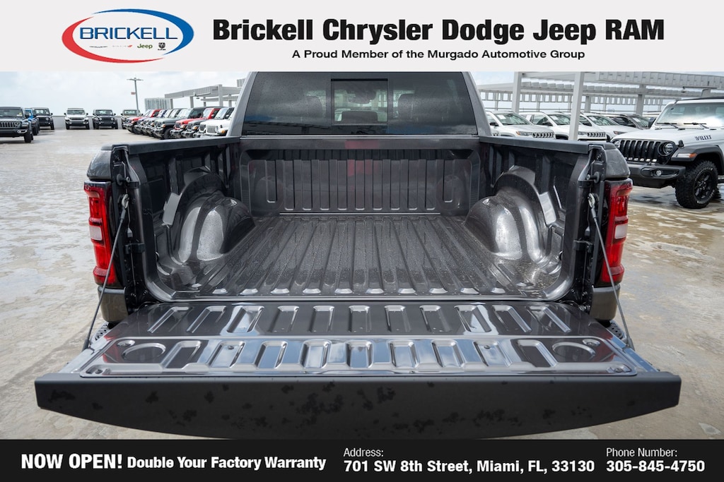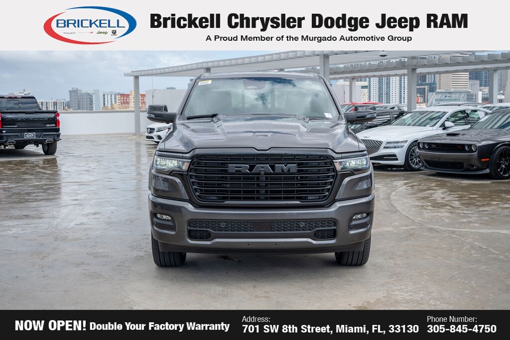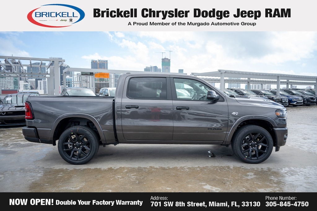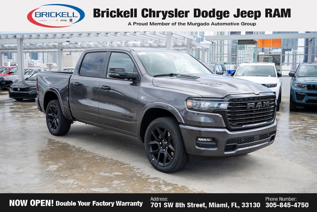 Price includes: $1000 - 2026 National Bonus Cash . Exp. 03/31/2026 $3500 - 2026 National Retail Bonus Cash . Exp. 03/31/2026 $500 - 2026 National 2026 Military Bonus Cash . Exp. 01/04/2027 Discover Your Next Vehicle at Brickell Chrysler Dodge Jeep Ram Welcome to Brickell CDJR, where we go beyond selling cars. We double the factory powertrain warranty, giving you added peace of mind. Our dealership offers one of the largest new car inventories in the region, ensuring you find the right vehicle Prices displayed do not included our Perma-plate. Our state-of-the-art service department is the largest in the country and is open seven days a week from 7 AM to 9 PM. Visit us at 701 SW 8th St, Miami, FL 33130, or call 305-777-2800 to learn more and schedule a test drive. The displayed price includes an incentive for financing with Brickell CDJR Finance Company. Outside financing and bank drafts are not accepted. All pre-owned vehicle exports are subject to an export fee. Prices apply only to customers who live, work, or worship in Broward, Miami-Dade, Palm Beach, Monroe, Collier, Hendry, Lee, Glades, Martin, St. Lucie, Okeechobee, Manatee, Hillsborough, Osceola, or Orange County. Customers outside these counties will pay an additional $ Taxes, title, registration, and dealer fees apply. Factory MSRP: $73,200 Granite Crystal Metallic Clearcoat 2026 Ram 1500 Laramie 4WD 8-Speed Automatic HEMI 5.7L V8 Multi Displacement VVT eTorque
