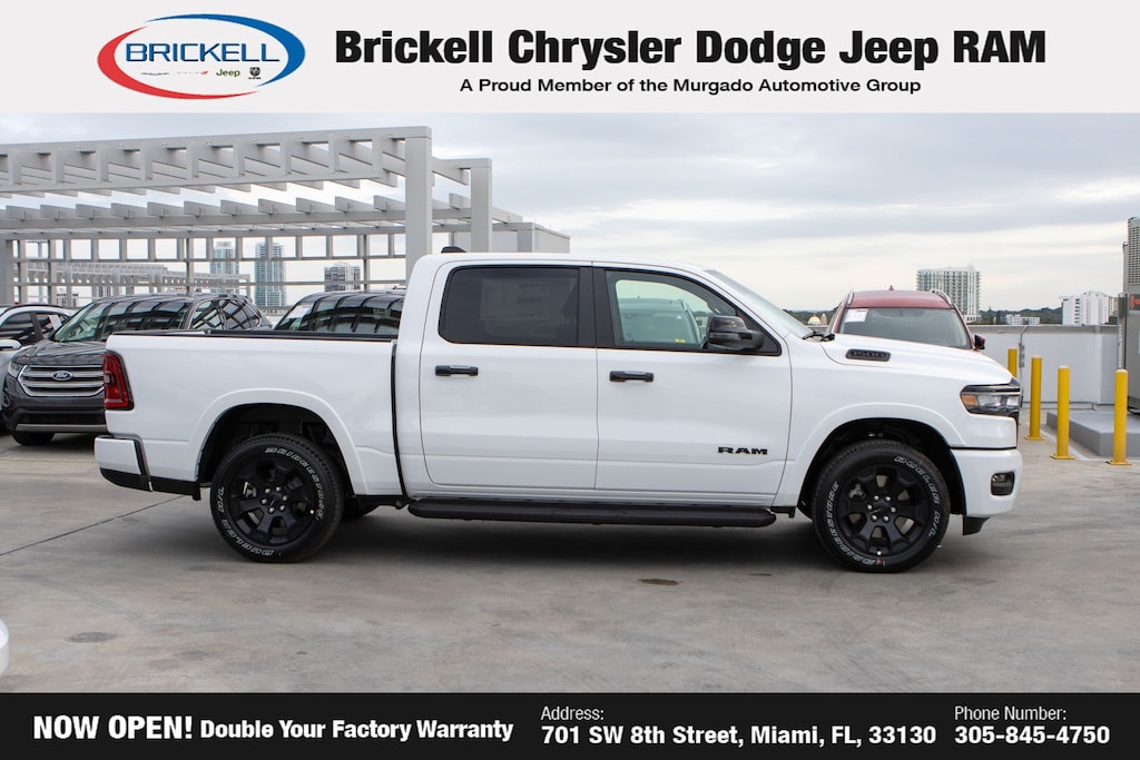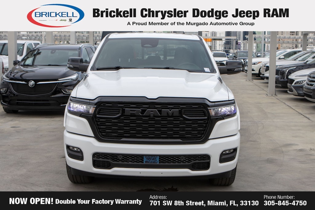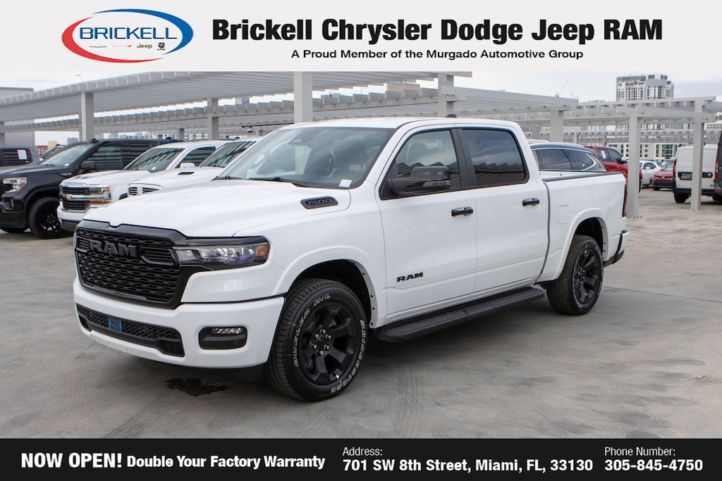 Price includes: $1000 - 2026 South BC Holiday LD Conquest Retail Bonus Cash . Exp. 01/05/2026 $1000 - 2026 South BC Retail Bonus Cash . Exp. 01/05/2026 $3500 - 2026 National Retail Consumer Cash . Exp. 01/05/2026 Discover Your Next Vehicle at Brickell Chrysler Dodge Jeep Ram Welcome to Brickell CDJR, where we go beyond selling cars. We double the factory powertrain warranty, giving you added peace of mind. Our dealership offers one of the largest new car inventories in the region, ensuring you find the right vehicle Prices displayed do not included our Perma-plate. Our state-of-the-art service department is the largest in the country and is open seven days a week from 7 AM to 9 PM. Visit us at 701 SW 8th St, Miami, FL 33130, or call 305-777-2800 to learn more and schedule a test drive. The displayed price includes an incentive for financing with Brickell CDJR Finance Company. Outside financing and bank drafts are not accepted. All pre-owned vehicle exports are subject to an export fee. Prices apply only to customers who live, work, or worship in Broward, Miami-Dade, Palm Beach, Monroe, Collier, Hendry, Lee, Glades, Martin, St. Lucie, Okeechobee, Manatee, Hillsborough, Osceola, or Orange County. Customers outside these counties will pay an additional $ Taxes, title, registration, and dealer fees apply. Factory MSRP: $62,220 Bright White Clearcoat 2026 Ram 1500 Big Horn/Lone Star 4WD 8-Speed Automatic 3.0L I6
