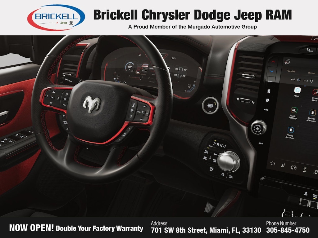 Price includes: $1000 - 2026 National Bonus Cash . Exp. 03/02/2026 $3500 - 2026 National Retail Consumer Cash . Exp. 03/02/2026 $500 - 2026 National 2026 Military Bonus Cash . Exp. 01/04/2027 Discover Your Next Vehicle at Brickell Chrysler Dodge Jeep Ram Welcome to Brickell CDJR, where we go beyond selling cars. We double the factory powertrain warranty, giving you added peace of mind. Our dealership offers one of the largest new car inventories in the region, ensuring you find the right vehicle Prices displayed do not included our Perma-plate. Our state-of-the-art service department is the largest in the country and is open seven days a week from 7 AM to 9 PM. Visit us at 701 SW 8th St, Miami, FL 33130, or call 305-777-2800 to learn more and schedule a test drive. The displayed price includes an incentive for financing with Brickell CDJR Finance Company. Outside financing and bank drafts are not accepted. All pre-owned vehicle exports are subject to an export fee. Prices apply only to customers who live, work, or worship in Broward, Miami-Dade, Palm Beach, Monroe, Collier, Hendry, Lee, Glades, Martin, St. Lucie, Okeechobee, Manatee, Hillsborough, Osceola, or Orange County. Customers outside these counties will pay an additional $ Taxes, title, registration, and dealer fees apply. Factory MSRP: $68,820 Hydro Blue Pearlcoat 2026 Ram 1500 Rebel 4WD 8-Speed Automatic 3.0L I6