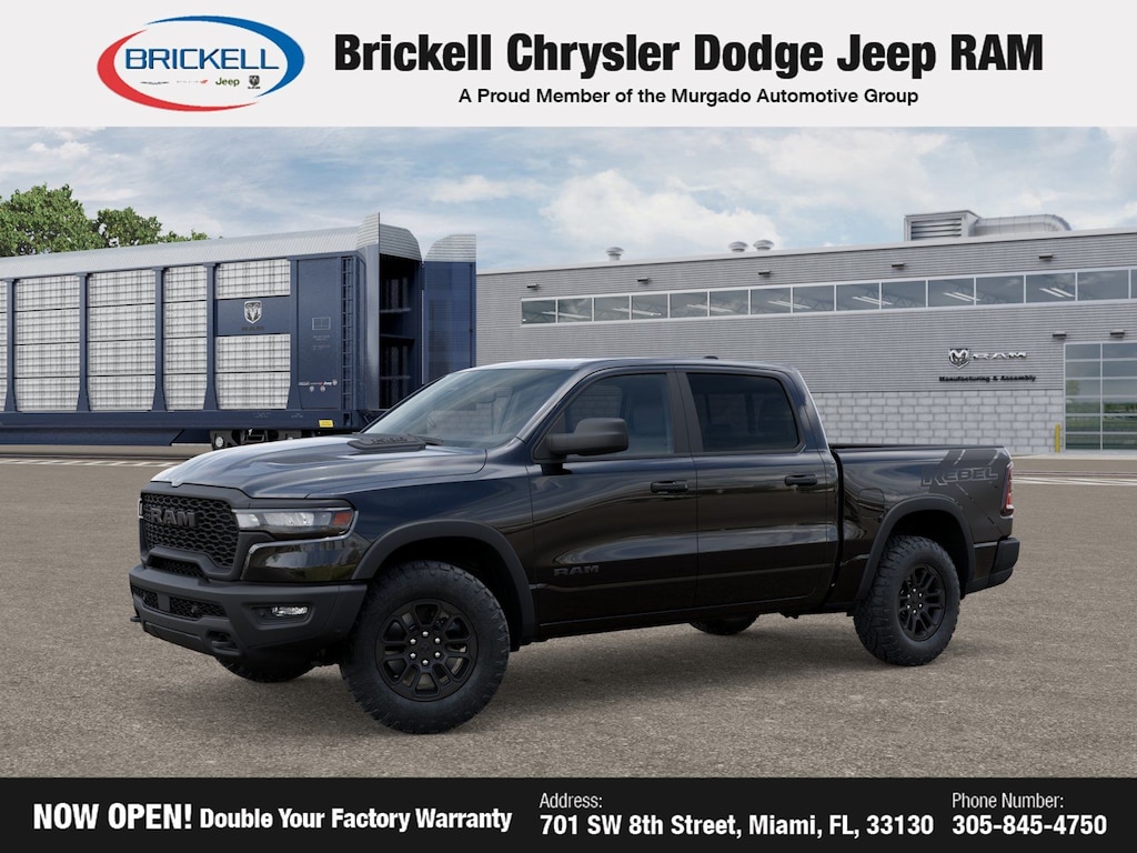 Price includes: $3500 - 2026 National Retail Consumer Cash . Exp. 02/02/2026 Discover Your Next Vehicle at Brickell Chrysler Dodge Jeep Ram Welcome to Brickell CDJR, where we go beyond selling cars. We double the factory powertrain warranty, giving you added peace of mind. Our dealership offers one of the largest new car inventories in the region, ensuring you find the right vehicle Prices displayed do not included our Perma-plate. Our state-of-the-art service department is the largest in the country and is open seven days a week from 7 AM to 9 PM. Visit us at 701 SW 8th St, Miami, FL 33130, or call 305-777-2800 to learn more and schedule a test drive. The displayed price includes an incentive for financing with Brickell CDJR Finance Company. Outside financing and bank drafts are not accepted. All pre-owned vehicle exports are subject to an export fee. Prices apply only to customers who live, work, or worship in Broward, Miami-Dade, Palm Beach, Monroe, Collier, Hendry, Lee, Glades, Martin, St. Lucie, Okeechobee, Manatee, Hillsborough, Osceola, or Orange County. Customers outside these counties will pay an additional $ Taxes, title, registration, and dealer fees apply. Factory MSRP: $67,335 Diamond Black Crystal Pearlcoat 2026 Ram 1500 Rebel 4WD 8-Speed Automatic 3.0L I6