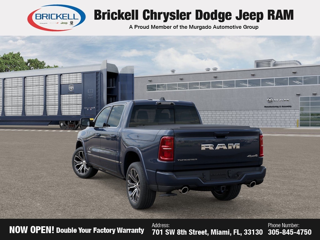 Discover Your Next Vehicle at Brickell Chrysler Dodge Jeep Ram Welcome to Brickell CDJR, where we go beyond selling cars. We double the factory powertrain warranty, giving you added peace of mind. Our dealership offers one of the largest new car inventories in the region, ensuring you find the right vehicle Prices displayed do not included our Perma-plate. Our state-of-the-art service department is the largest in the country and is open seven days a week from 7 AM to 9 PM. Visit us at 701 SW 8th St, Miami, FL 33130, or call 305-777-2800 to learn more and schedule a test drive. The displayed price includes an incentive for financing with Brickell CDJR Finance Company. Outside financing and bank drafts are not accepted. All pre-owned vehicle exports are subject to an export fee. Prices apply only to customers who live, work, or worship in Broward, Miami-Dade, Palm Beach, Monroe, Collier, Hendry, Lee, Glades, Martin, St. Lucie, Okeechobee, Manatee, Hillsborough, Osceola, or Orange County. Customers outside these counties will pay an additional $ Taxes, title, registration, and dealer fees apply. Factory MSRP: $92,380 Forged Blue Metallic 2026 Ram 1500 Tungsten 4WD 8-Speed Automatic 3.0L I6