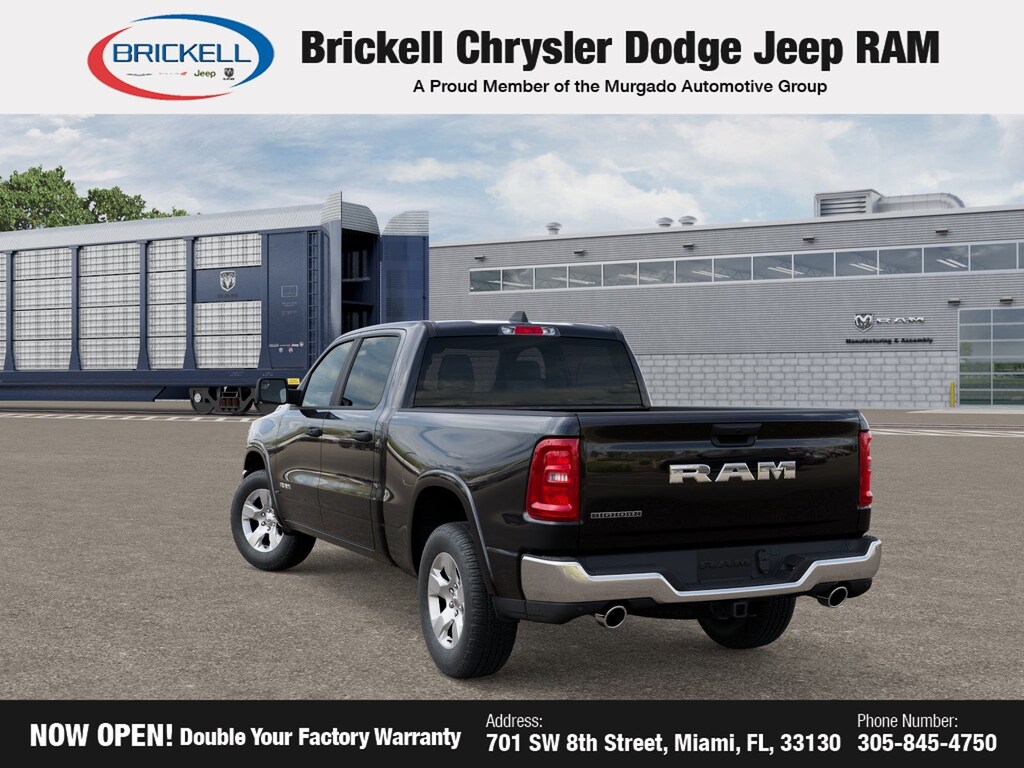Price includes: $1000 - 2026 Southeast BC Retail Bonus Cash. Exp. 04/30/2026 $3500 - 2026 National Retail Bonus Cash . Exp. 04/30/2026 $500 - 2026 National 2026 Military Bonus Cash . Exp. 01/04/2027 Discover Your Next Vehicle at Brickell Chrysler Dodge Jeep Ram Welcome to Brickell CDJR, where we go beyond selling cars. We double the factory powertrain warranty, giving you added peace of mind. Our dealership offers one of the largest new car inventories in the region, ensuring you find the right vehicle Prices displayed do not included our Perma-plate. Our state-of-the-art service department is the largest in the country and is open seven days a week from 7 AM to 9 PM. Visit us at 701 SW 8th St, Miami, FL 33130, or call 305-777-2800 to learn more and schedule a test drive. The displayed price includes an incentive for financing with Brickell CDJR Finance Company. Outside financing and bank drafts are not accepted. All pre-owned vehicle exports are subject to an export fee. Prices apply only to customers who live, work, or worship in Broward, Miami-Dade, Palm Beach, Monroe, Collier, Hendry, Lee, Glades, Martin, St. Lucie, Okeechobee, Manatee, Hillsborough, Osceola, or Orange County. Customers outside these counties will pay an additional $ Taxes, title, registration, and dealer fees apply. Factory MSRP: $55,255 Diamond Black Crystal Pearlcoat 2026 Ram 1500 Big Horn/Lone Star RWD 8-Speed Automatic 3.0L I6