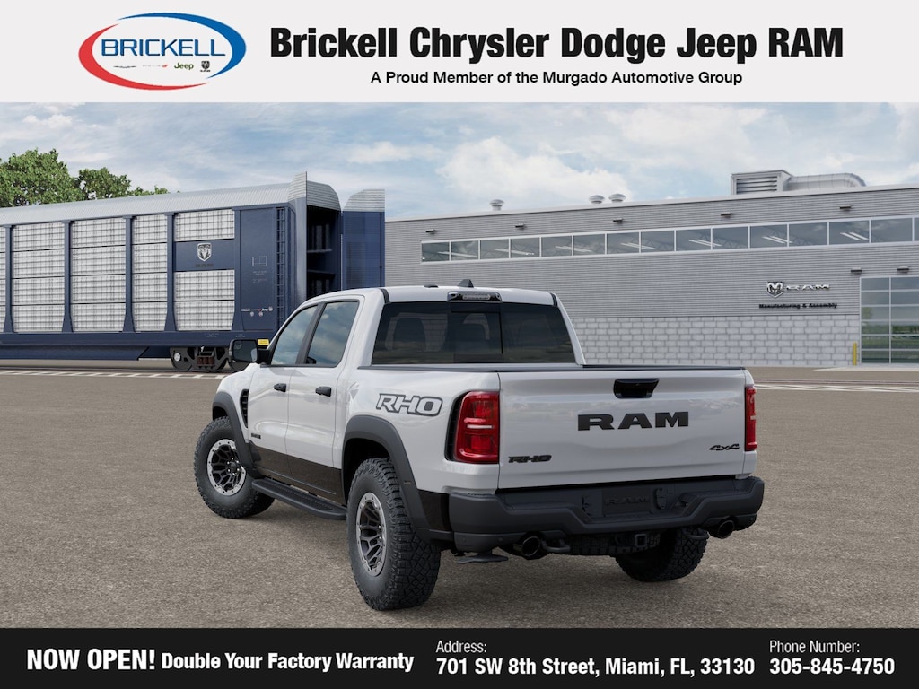 Discover Your Next Vehicle at Brickell Chrysler Dodge Jeep Ram Welcome to Brickell CDJR, where we go beyond selling cars. We double the factory powertrain warranty, giving you added peace of mind. Our dealership offers one of the largest new car inventories in the region, ensuring you find the right vehicle Prices displayed do not included our Perma-plate. Our state-of-the-art service department is the largest in the country and is open seven days a week from 7 AM to 9 PM. Visit us at 701 SW 8th St, Miami, FL 33130, or call 305-777-2800 to learn more and schedule a test drive. The displayed price includes an incentive for financing with Brickell CDJR Finance Company. Outside financing and bank drafts are not accepted. All pre-owned vehicle exports are subject to an export fee. Prices apply only to customers who live, work, or worship in Broward, Miami-Dade, Palm Beach, Monroe, Collier, Hendry, Lee, Glades, Martin, St. Lucie, Okeechobee, Manatee, Hillsborough, Osceola, or Orange County. Customers outside these counties will pay an additional $ Taxes, title, registration, and dealer fees apply. Factory MSRP: $94,200 Bright White Clearcoat 2026 Ram 1500 RHO 4WD 8-Speed Automatic 3.0L I6