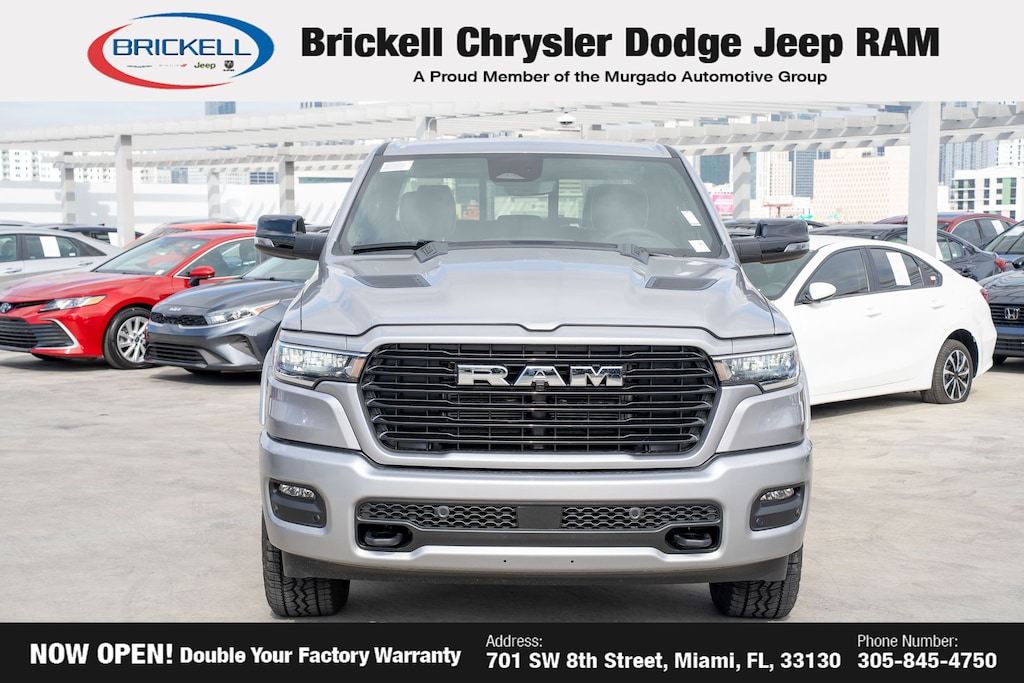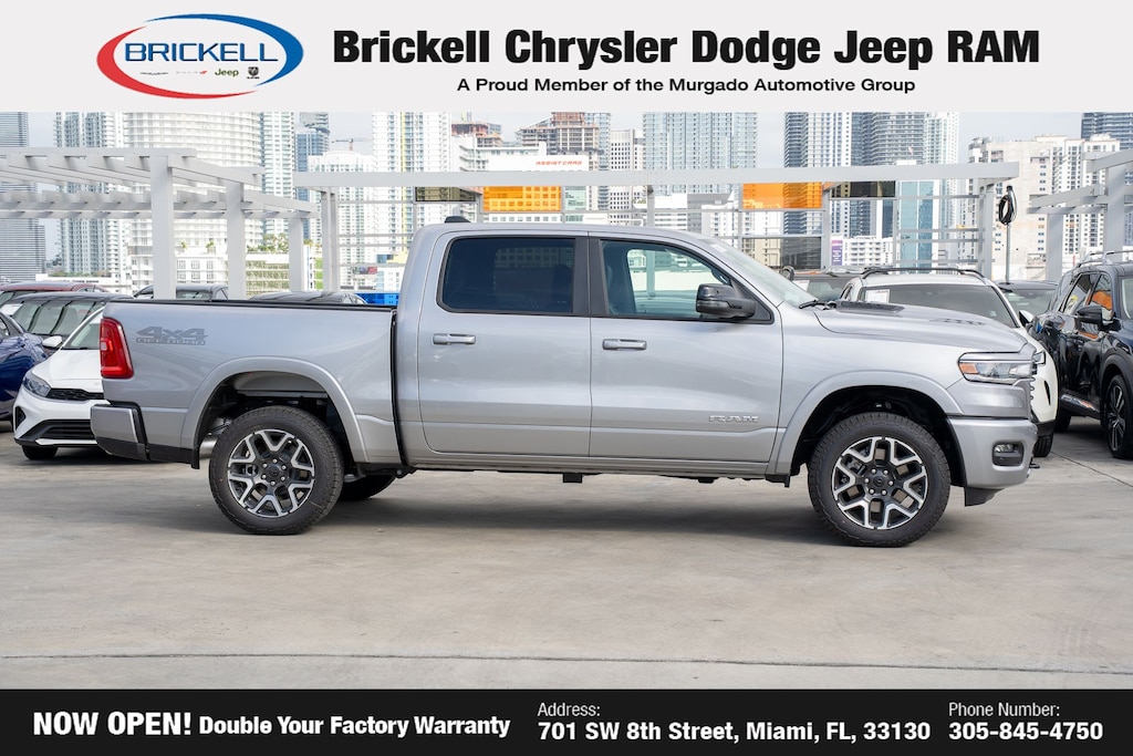 Price includes: $1000 - 2026 South BC Holiday LD Conquest Retail Bonus Cash . Exp. 01/05/2026 $1000 - 2026 South BC Retail Bonus Cash . Exp. 01/05/2026 $3500 - 2026 National Retail Consumer Cash . Exp. 01/05/2026 Discover Your Next Vehicle at Brickell Chrysler Dodge Jeep Ram Welcome to Brickell CDJR, where we go beyond selling cars. We double the factory powertrain warranty, giving you added peace of mind. Our dealership offers one of the largest new car inventories in the region, ensuring you find the right vehicle Prices displayed do not included our Perma-plate. Our state-of-the-art service department is the largest in the country and is open seven days a week from 7 AM to 9 PM. Visit us at 701 SW 8th St, Miami, FL 33130, or call 305-777-2800 to learn more and schedule a test drive. The displayed price includes an incentive for financing with Brickell CDJR Finance Company. Outside financing and bank drafts are not accepted. All pre-owned vehicle exports are subject to an export fee. Prices apply only to customers who live, work, or worship in Broward, Miami-Dade, Palm Beach, Monroe, Collier, Hendry, Lee, Glades, Martin, St. Lucie, Okeechobee, Manatee, Hillsborough, Osceola, or Orange County. Customers outside these counties will pay an additional $ Taxes, title, registration, and dealer fees apply. Factory MSRP: $71,940 Billet Silver Metallic Clearcoat 2026 Ram 1500 Laramie 4WD 8-Speed Automatic 3.0L I6