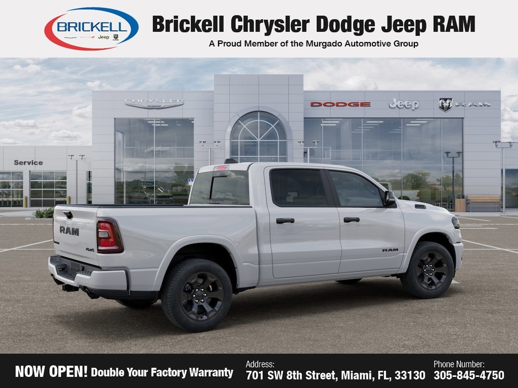 Price includes: $1000 - 2026 Southeast BC Retail Bonus Cash. Exp. 03/02/2026 $3500 - 2026 National Retail Consumer Cash . Exp. 03/02/2026 $500 - 2026 National 2026 Military Bonus Cash . Exp. 01/04/2027 Discover Your Next Vehicle at Brickell Chrysler Dodge Jeep Ram Welcome to Brickell CDJR, where we go beyond selling cars. We double the factory powertrain warranty, giving you added peace of mind. Our dealership offers one of the largest new car inventories in the region, ensuring you find the right vehicle Prices displayed do not included our Perma-plate. Our state-of-the-art service department is the largest in the country and is open seven days a week from 7 AM to 9 PM. Visit us at 701 SW 8th St, Miami, FL 33130, or call 305-777-2800 to learn more and schedule a test drive. The displayed price includes an incentive for financing with Brickell CDJR Finance Company. Outside financing and bank drafts are not accepted. All pre-owned vehicle exports are subject to an export fee. Prices apply only to customers who live, work, or worship in Broward, Miami-Dade, Palm Beach, Monroe, Collier, Hendry, Lee, Glades, Martin, St. Lucie, Okeechobee, Manatee, Hillsborough, Osceola, or Orange County. Customers outside these counties will pay an additional $ Taxes, title, registration, and dealer fees apply. Bright White Clearcoat 2026 Ram 1500 Big Horn/Lone Star 4WD 8-Speed Automatic 3.0L I6