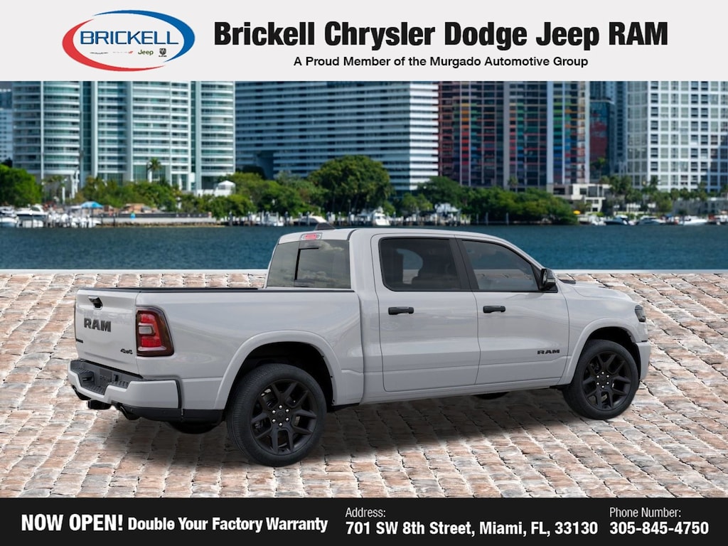Price includes: $1500 - 2026 Southeast BC Retail Bonus Cash. Exp. 04/30/2026 $3500 - 2026 National Retail Bonus Cash . Exp. 04/30/2026 Discover Your Next Vehicle at Brickell Chrysler Dodge Jeep Ram Welcome to Brickell CDJR, where we go beyond selling cars. We double the factory powertrain warranty, giving you added peace of mind. Our dealership offers one of the largest new car inventories in the region, ensuring you find the right vehicle Prices displayed do not included our Perma-plate. Our state-of-the-art service department is the largest in the country and is open seven days a week from 7 AM to 9 PM. Visit us at 701 SW 8th St, Miami, FL 33130, or call 305-777-2800 to learn more and schedule a test drive. The displayed price includes an incentive for financing with Brickell CDJR Finance Company. Outside financing and bank drafts are not accepted. All pre-owned vehicle exports are subject to an export fee. Prices apply only to customers who live, work, or worship in Broward, Miami-Dade, Palm Beach, Monroe, Collier, Hendry, Lee, Glades, Martin, St. Lucie, Okeechobee, Manatee, Hillsborough, Osceola, or Orange County. Customers outside these counties will pay an additional $ Taxes, title, registration, and dealer fees apply. Bright White Clearcoat 2026 Ram 1500 Laramie 4WD 8-Speed Automatic 3.0L I6