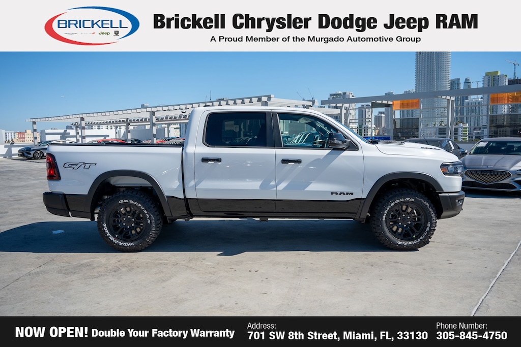 Price includes: $1000 - 2026 National Bonus Cash . Exp. 03/02/2026 $3500 - 2026 National Retail Consumer Cash . Exp. 03/02/2026 $500 - 2026 National 2026 Military Bonus Cash . Exp. 01/04/2027 Discover Your Next Vehicle at Brickell Chrysler Dodge Jeep Ram Welcome to Brickell CDJR, where we go beyond selling cars. We double the factory powertrain warranty, giving you added peace of mind. Our dealership offers one of the largest new car inventories in the region, ensuring you find the right vehicle Prices displayed do not included our Perma-plate. Our state-of-the-art service department is the largest in the country and is open seven days a week from 7 AM to 9 PM. Visit us at 701 SW 8th St, Miami, FL 33130, or call 305-777-2800 to learn more and schedule a test drive. The displayed price includes an incentive for financing with Brickell CDJR Finance Company. Outside financing and bank drafts are not accepted. All pre-owned vehicle exports are subject to an export fee. Prices apply only to customers who live, work, or worship in Broward, Miami-Dade, Palm Beach, Monroe, Collier, Hendry, Lee, Glades, Martin, St. Lucie, Okeechobee, Manatee, Hillsborough, Osceola, or Orange County. Customers outside these counties will pay an additional $ Taxes, title, registration, and dealer fees apply. Factory MSRP: $73,520 Bright White Clearcoat 2026 Ram 1500 Rebel 4WD 8-Speed Automatic 3.0L I6