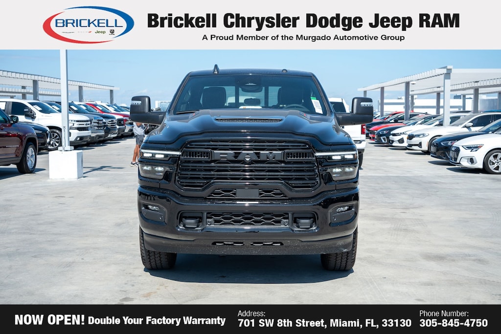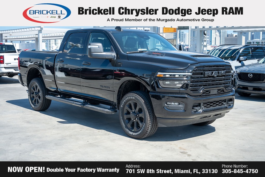 Price includes: $1000 - 2026 National Bonus Cash . Exp. 04/30/2026 $500 - 2026 National 2026 Military Bonus Cash . Exp. 01/04/2027 Discover Your Next Vehicle at Brickell Chrysler Dodge Jeep Ram Welcome to Brickell CDJR, where we go beyond selling cars. We double the factory powertrain warranty, giving you added peace of mind. Our dealership offers one of the largest new car inventories in the region, ensuring you find the right vehicle Prices displayed do not included our Perma-plate. Our state-of-the-art service department is the largest in the country and is open seven days a week from 7 AM to 9 PM. Visit us at 701 SW 8th St, Miami, FL 33130, or call 305-777-2800 to learn more and schedule a test drive. The displayed price includes an incentive for financing with Brickell CDJR Finance Company. Outside financing and bank drafts are not accepted. All pre-owned vehicle exports are subject to an export fee. Prices apply only to customers who live, work, or worship in Broward, Miami-Dade, Palm Beach, Monroe, Collier, Hendry, Lee, Glades, Martin, St. Lucie, Okeechobee, Manatee, Hillsborough, Osceola, or Orange County. Customers outside these counties will pay an additional $ Taxes, title, registration, and dealer fees apply. Factory MSRP: $89,630 Diamond Black Crystal Pearlcoat 2026 Ram 2500 Laramie 4WD 8-Speed Automatic 6.7L I6
