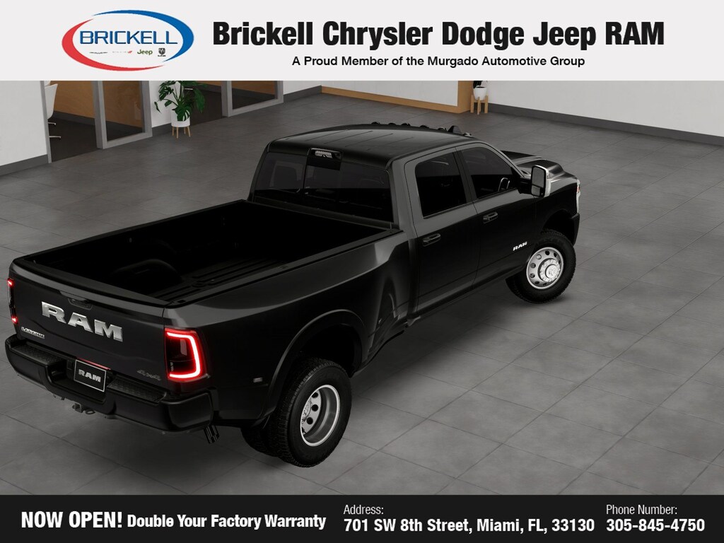 Price includes: $1000 - 2026 National Bonus Cash . Exp. 11/03/2025 Discover Your Next Vehicle at Brickell Chrysler Dodge Jeep Ram Welcome to Brickell CDJR, where we go beyond selling cars. We double the factory powertrain warranty, giving you added peace of mind. Our dealership offers one of the largest new car inventories in the region, ensuring you find the right vehicle Prices displayed do not included our Perma-plate. Our state-of-the-art service department is the largest in the country and is open seven days a week from 7 AM to 9 PM. Visit us at 701 SW 8th St, Miami, FL 33130, or call 305-777-2800 to learn more and schedule a test drive. The displayed price includes an incentive for financing with Brickell CDJR Finance Company. Outside financing and bank drafts are not accepted. All pre-owned vehicle exports are subject to an export fee. Prices apply only to customers who live, work, or worship in Broward, Miami-Dade, Palm Beach, Monroe, Collier, Hendry, Lee, Glades, Martin, St. Lucie, Okeechobee, Manatee, Hillsborough, Osceola, or Orange County. Customers outside these counties will pay an additional $ Taxes, title, registration, and dealer fees apply. Factory MSRP: $89,610 Diamond Black Crystal Pearlcoat 2026 Ram 3500 Laramie 4WD 8-Speed Automatic 6.7L I6