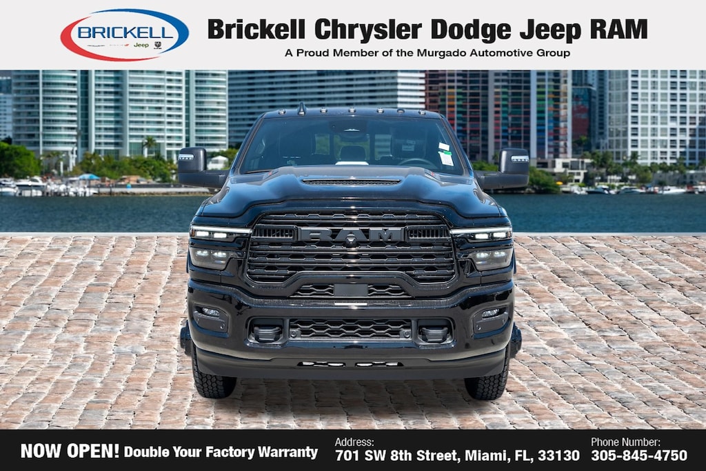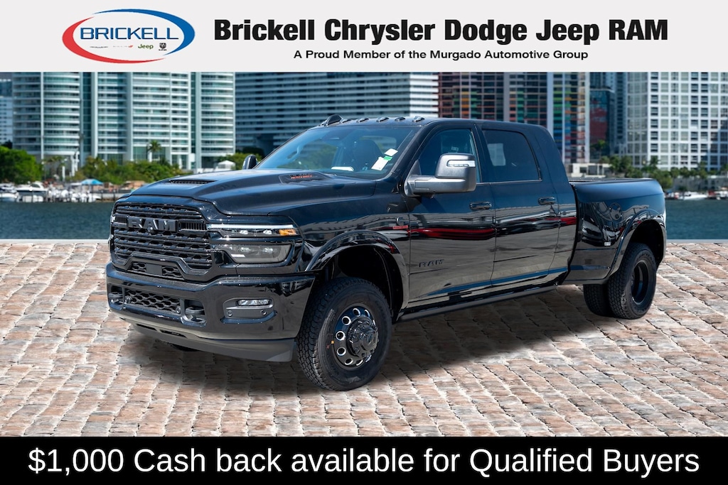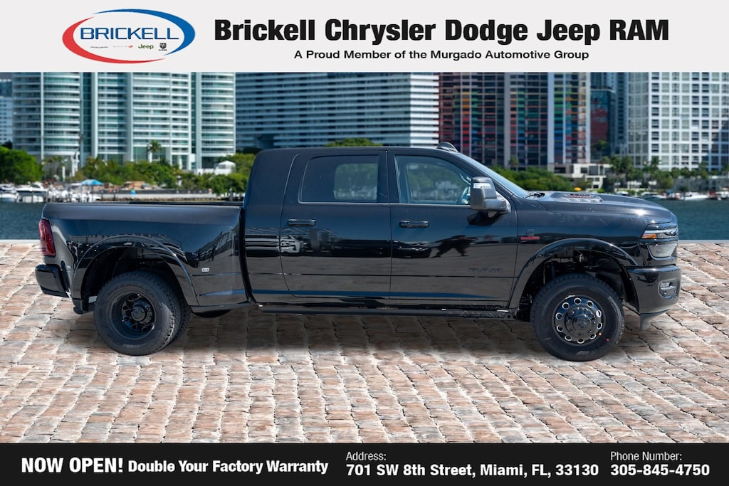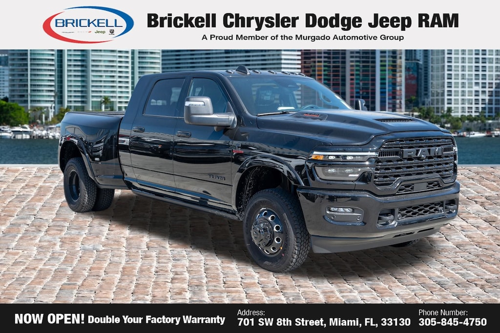 Price includes: $1000 - 2026 National Bonus Cash . Exp. 04/30/2026 Discover Your Next Vehicle at Brickell Chrysler Dodge Jeep Ram Welcome to Brickell CDJR, where we go beyond selling cars. We double the factory powertrain warranty, giving you added peace of mind. Our dealership offers one of the largest new car inventories in the region, ensuring you find the right vehicle Prices displayed do not included our Perma-plate. Our state-of-the-art service department is the largest in the country and is open seven days a week from 7 AM to 9 PM. Visit us at 701 SW 8th St, Miami, FL 33130, or call 305-777-2800 to learn more and schedule a test drive. The displayed price includes an incentive for financing with Brickell CDJR Finance Company. Outside financing and bank drafts are not accepted. All pre-owned vehicle exports are subject to an export fee. Prices apply only to customers who live, work, or worship in Broward, Miami-Dade, Palm Beach, Monroe, Collier, Hendry, Lee, Glades, Martin, St. Lucie, Okeechobee, Manatee, Hillsborough, Osceola, or Orange County. Customers outside these counties will pay an additional $ Taxes, title, registration, and dealer fees apply. Factory MSRP: $108,175 Diamond Black Crystal Pearlcoat 2026 Ram 3500 Limited 4WD 8-Speed Automatic 6.7L I6