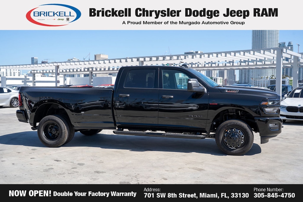 Price includes: $1000 - 2026 National Bonus Cash . Exp. 03/31/2026 Discover Your Next Vehicle at Brickell Chrysler Dodge Jeep Ram Welcome to Brickell CDJR, where we go beyond selling cars. We double the factory powertrain warranty, giving you added peace of mind. Our dealership offers one of the largest new car inventories in the region, ensuring you find the right vehicle Prices displayed do not included our Perma-plate. Our state-of-the-art service department is the largest in the country and is open seven days a week from 7 AM to 9 PM. Visit us at 701 SW 8th St, Miami, FL 33130, or call 305-777-2800 to learn more and schedule a test drive. The displayed price includes an incentive for financing with Brickell CDJR Finance Company. Outside financing and bank drafts are not accepted. All pre-owned vehicle exports are subject to an export fee. Prices apply only to customers who live, work, or worship in Broward, Miami-Dade, Palm Beach, Monroe, Collier, Hendry, Lee, Glades, Martin, St. Lucie, Okeechobee, Manatee, Hillsborough, Osceola, or Orange County. Customers outside these counties will pay an additional $ Taxes, title, registration, and dealer fees apply. Factory MSRP: $83,465 Diamond Black Crystal Pearlcoat 2026 Ram 3500 Big Horn 4WD 8-Speed Automatic 6.7L I6