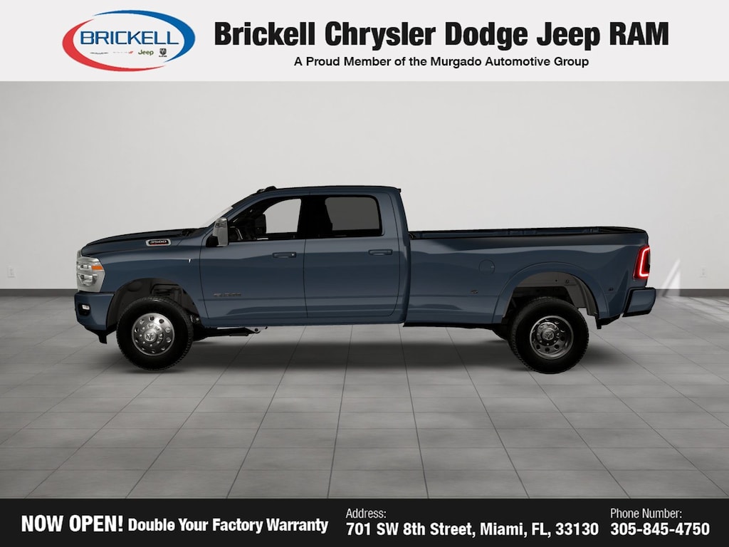 Price includes: $1000 - 2026 National Bonus Cash . Exp. 11/03/2025 Discover Your Next Vehicle at Brickell Chrysler Dodge Jeep Ram Welcome to Brickell CDJR, where we go beyond selling cars. We double the factory powertrain warranty, giving you added peace of mind. Our dealership offers one of the largest new car inventories in the region, ensuring you find the right vehicle Prices displayed do not included our Perma-plate. Our state-of-the-art service department is the largest in the country and is open seven days a week from 7 AM to 9 PM. Visit us at 701 SW 8th St, Miami, FL 33130, or call 305-777-2800 to learn more and schedule a test drive. The displayed price includes an incentive for financing with Brickell CDJR Finance Company. Outside financing and bank drafts are not accepted. All pre-owned vehicle exports are subject to an export fee. Prices apply only to customers who live, work, or worship in Broward, Miami-Dade, Palm Beach, Monroe, Collier, Hendry, Lee, Glades, Martin, St. Lucie, Okeechobee, Manatee, Hillsborough, Osceola, or Orange County. Customers outside these counties will pay an additional $ Taxes, title, registration, and dealer fees apply. Factory MSRP: $86,125 Forged Blue Metallic 2026 Ram 3500 Laramie 4WD 8-Speed Automatic 6.7L I6