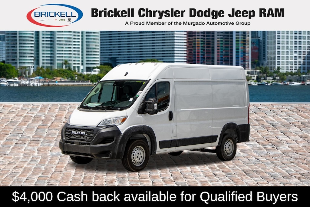 Price includes: $4000 - 2026 National Bonus Cash . Exp. 04/30/2026 Discover Your Next Vehicle at Brickell Chrysler Dodge Jeep Ram Welcome to Brickell CDJR, where we go beyond selling cars. We double the factory powertrain warranty, giving you added peace of mind. Our dealership offers one of the largest new car inventories in the region, ensuring you find the right vehicle Prices displayed do not included our Perma-plate. Our state-of-the-art service department is the largest in the country and is open seven days a week from 7 AM to 9 PM. Visit us at 701 SW 8th St, Miami, FL 33130, or call 305-777-2800 to learn more and schedule a test drive. The displayed price includes an incentive for financing with Brickell CDJR Finance Company. Outside financing and bank drafts are not accepted. All pre-owned vehicle exports are subject to an export fee. Prices apply only to customers who live, work, or worship in Broward, Miami-Dade, Palm Beach, Monroe, Collier, Hendry, Lee, Glades, Martin, St. Lucie, Okeechobee, Manatee, Hillsborough, Osceola, or Orange County. Customers outside these counties will pay an additional $ Taxes, title, registration, and dealer fees apply. Factory MSRP: $56,535 Bright White Clearcoat 2026 Ram ProMaster 2500 High Roof FWD 9-Speed Automatic 3.6L V6 24V VVT