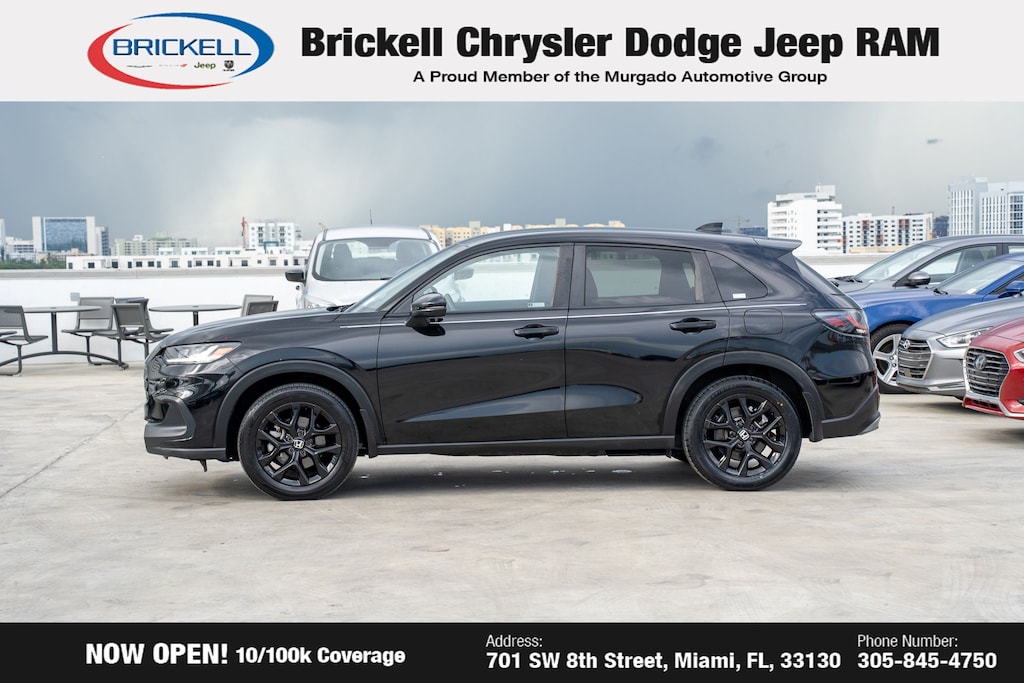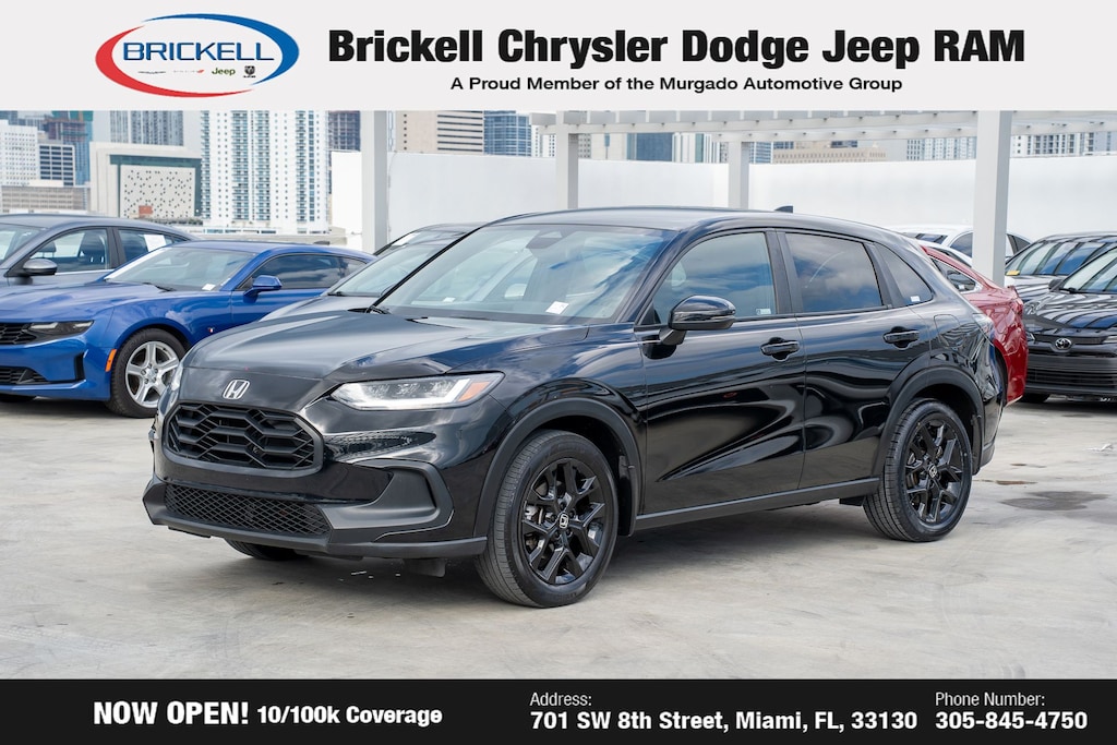 Crystal Black Pearl 2023 Honda HR-V Sport FWD CVT 2.0L I4 DOHC 16V i-VTEC HR-V Sport, 4D Sport Utility, 2.0L I4 DOHC 16V i-VTEC, CVT, FWD, Black w/Cloth Seat Trim.