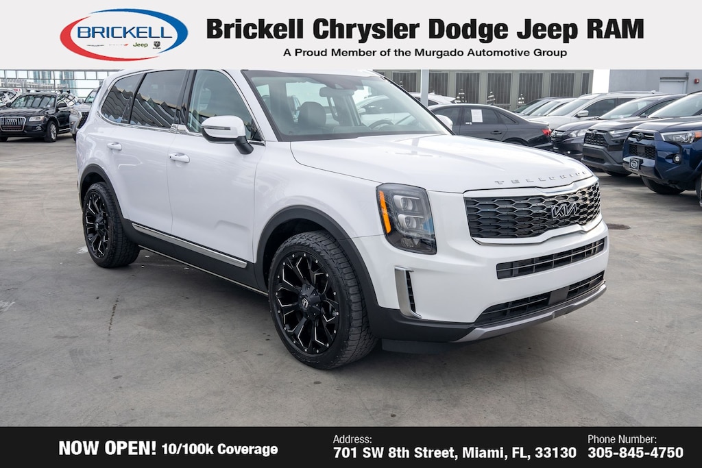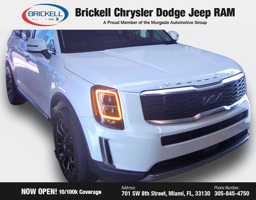 Discover the perfect balance of style, technology, and capability in the 2022 Kia Telluride EX. Visit our showroom today and experience the difference for yourself. At Brickell CDJR, we make buying a pre-owned vehicle easy and stress-free. Every pre-owned vehicle is thoroughly inspected to ensure quality and reliability. For added confidence, we include a 10-year/100,000-mile powertrain warranty on all non-European brands at no additional cost. Our dealership offers one of the largest selections of pre-owned inventory in the region, so you can find the right car, truck, or SUV for your needs. Our state-of-the-art service department, the largest in the country, is open seven days a week from 7 AM to 9 PM, ensuring your vehicle stays in top condition. Visit us at 701 SW 8th St, Miami, FL 33130, or call 305-777-2800 to learn more and schedule a test drive. The displayed price includes an incentive for financing with Brickell CDJR Finance Company. Price does not included our Perma-Plate .Outside financing and bank drafts are not accepted. All pre-owned vehicle exports are subject to an export fee. Taxes, title, registration, and dealer fees apply.